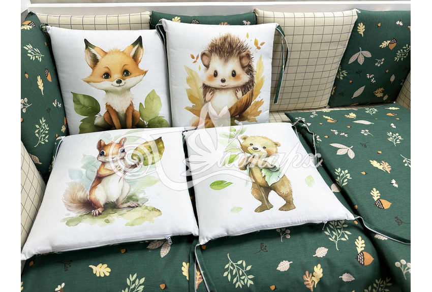 Бортик составной: 12 подушек 31х34 см на замочках упакованы в сумку-переноску.